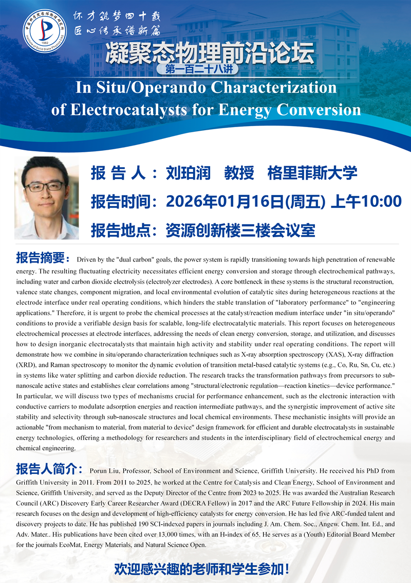 【2026.01.16】In Situ/Operando Characterization of Electrocatalysts for Energy Conversion(128讲 刘珀润 教授 格里菲斯大学)