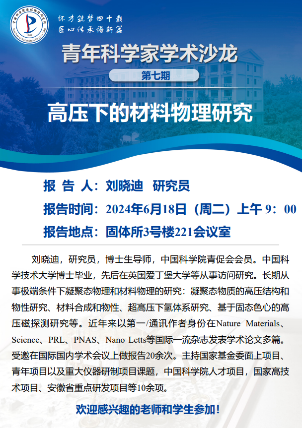 【2024.06.18】高压下的材料物理研究( 刘晓迪 研究员 固体所 )