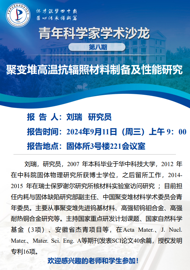 【2024.09.11】聚变堆高温抗辐照材料制备及性能研究( 刘瑞 研究员 固体所 )