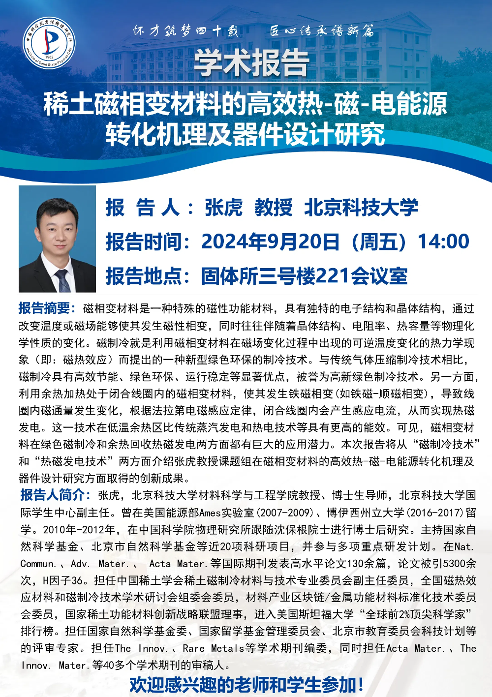 【2024.09.20】稀土磁相变材料的高效热-磁-电能源转化机理及器件设计研究(张虎 教授 北京科技大学)
