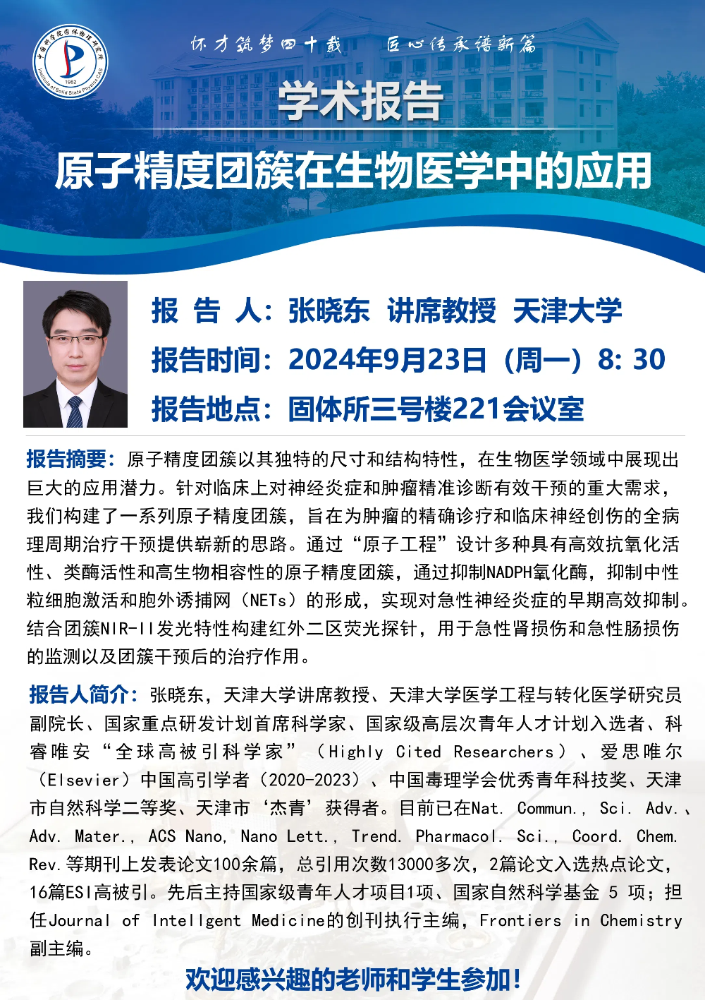 【2024.09.23】原子精度团簇在生物医学中的应用(张晓东 讲席教授 天津大学)