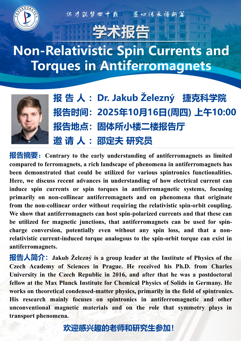 【2025.10.16】Non-Relativistic Spin Currents and Torques in Antiferromagnets”(Dr. Jakub Železný 捷克科学院)