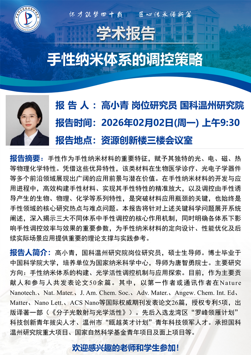 【2026.02.02】手性纳米体系的调控策略(高小青 研究员 国科温州研究院)