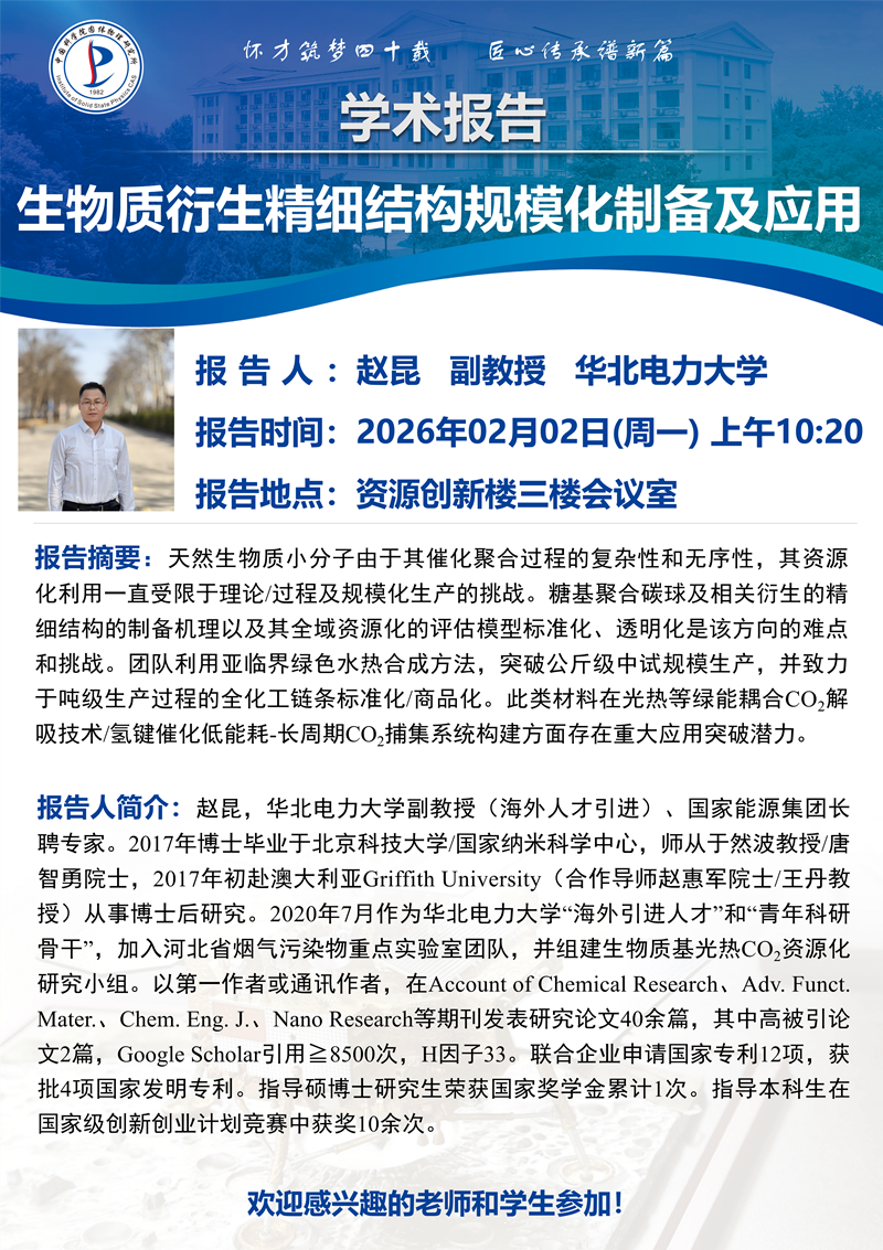 【2026.02.02】生物质衍生精细结构规模化制备及应用(赵昆 副教授 华北电力大学)