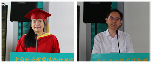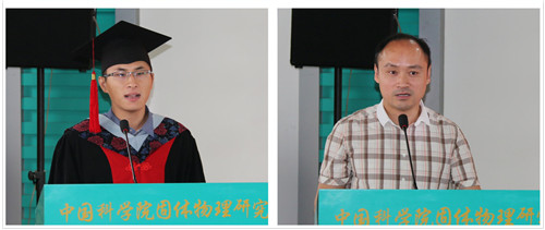 导师代表和毕业生代表分别上台讲话。秦晓英研究员代表导师们向毕业生提出了几点希望和祝福:希望同学们不要放弃梦想,不要忘记继续学习,学会与人交流、交往、合作,在各方面都不断地完善自我,充满信心地面对未来;希望大家无愧于固体所的期盼,在各自的岗位上兢兢业业、艰苦奋斗、努力拼搏,创造出辉煌的业绩,假以时日成长为参天大树!刘育博士代表全体毕业生发言,他深情回顾了在所学习和生活的点滴,感恩研究生院、导师们以及家长的培养教育,感谢同学们的支持鼓励,表示在以后的学习或者工作中,会再接再厉、奋勇向前,不管以后大家身处何方,只要足够努力并且坚持努力,生活终将会对得起自己的付出。