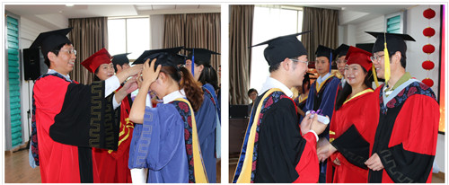 李贵明副处长宣读了2015届毕业生名单及优秀毕业生、三好学生名单。在欢快而庄严的乐曲声中,孟国文、曾雉、刘长松三位所领导身着导师服,为每一位毕业生扶正流苏、颁发毕业证书。博士毕业班班长魏仁怀带领全体毕业生宣读了毕业誓词。他们庄严宣誓,在未来的生活中将自信的迎接挑战,在挑战中升华价值;铭记师恩,感恩母校,不辜负师长的厚望,不辜负青春的梦想!一朝师生情,终生缅于怀,典礼结束后同学们向导师们敬献了鲜花,感谢老师几年来的指导和教诲。
