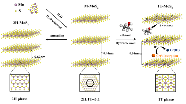 MoS2金属性的1T相结构由于其富硫特性、独特的各向异性、具有用于离子传输和吸附的可渗透通道以及去除水中重金属离子的性能等优点引起人们的高度关注。然而,其高形成能导致很难直接合成高纯度的1T相MoS2。此外,研究发现,MoS2在吸附后不稳定,1T相会完全转变为2H相或宽间距结构塌陷,导致其循环耐久性下降。目前高纯度1T相MoS2的主要制备方法是气相沉积法,批量应用于水处理方面还比较困难。因此,为了提高重金属去除能力,亟需合成高纯度1T相MoS2并确保其层间结构在吸附过程中稳定不发生塌缩。