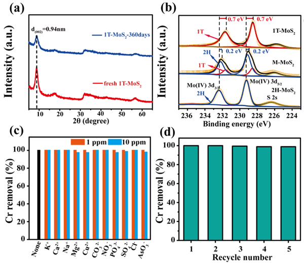 图2.(a)1T-MoS2放置一年时间的XRD晶体结构表征;(b)Mo元素的高分辨XPS谱图;1T-MoS2对水体中Cr(VI)的(c)吸附性能以及(d)循环稳定性。