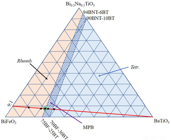 图1. (1-y)(0.9BiFeO3-0.1Bi0.5Na0.5TiO3)-yBaTi1-xMnxO3三元体系组分相图及其准同型相界区域。