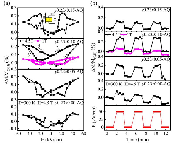 图2. (1-y)(0.9BiFeO3-0.1Bi0.5Na0.5TiO3)-yBaTi1-xMnxO3固溶体准同型相界附近的室温电控磁效应。