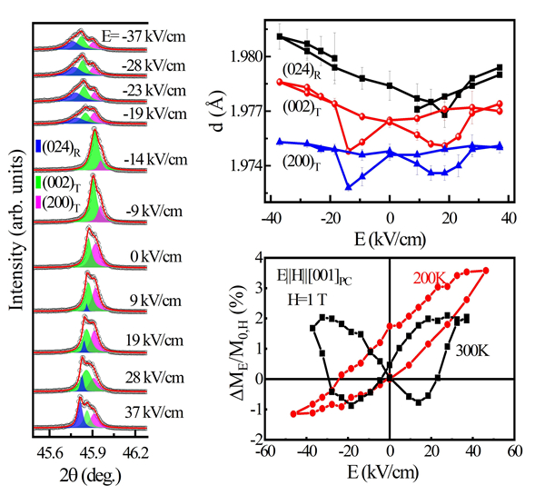 图3. 0.58BiFeO3-0.42Bi0.5K0.5TiO3单晶在不同温度下的电控磁效应、原位电压下高分辨X-射线衍射谱(XRD)的演化以及{002}PC晶面间距随外加电压的变化。