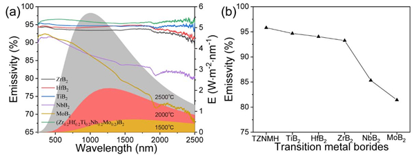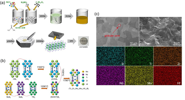 硼化物超高温陶瓷由于其独特的高温热/力学性能,成为极端有氧热环境下服役的理想候选材料。然而,硼化物陶瓷在2500 ℃以上的强氧化流动环境中会发生氧化烧蚀,导致构件失效。解决这一难题的一种有效途径是采用具有较高热发射率的材料,通过热辐射的方式在空间飞行中有效散热,降低构件的温度梯度和热应力使其能够承受更高的热通量,从而提高抗氧化烧蚀性能。此外,由于硼化物陶瓷固有的低损伤容限,在响应热冲击时易于断裂导致失效。高熵硼化物由于其高熵效应而具有优异的力学性能和独特的性能组合,可望解决这些难题。然而,高纯超细高熵硼化物粉体的设计制备、单相固溶机理及热发射率的增强机制仍不明晰;同时,其陶瓷块体的致密化和力学性能的提升也是亟需解决的问题。