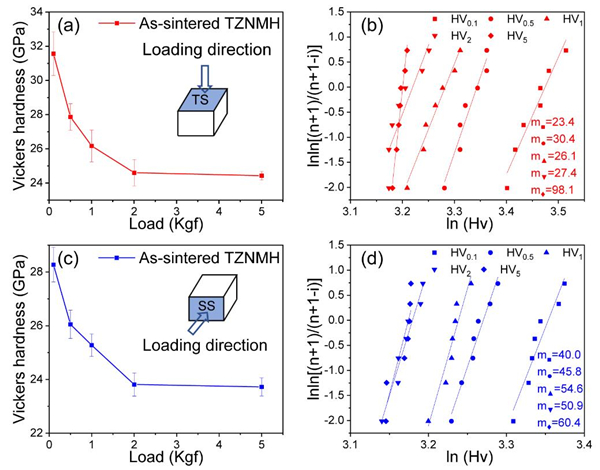 研究人员进一步采用放电等离子烧结合成了致密度为99.7%的高熵硼化物陶瓷。在0.98 N的载荷下,高熵陶瓷块体的维氏硬度达到了31.6 GPa。态密度计算表明,优异的力学性能是金属原子与硼原子之间强杂化的结果。同时,固溶强化机制和织构组织对硬度增强也具有积极的影响。在经过1800 ℃热处理60 h后,高熵陶瓷保持单相六方结构,元素分布均匀,在0.98 N的载荷下,其硬度仍然超过30 GPa。该工作阐明了高熵硼化物陶瓷的设计原理和固溶机制,为高性能热防护材料提供了备选方案。