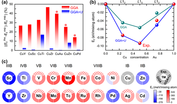 铜基过渡金属(Cu-TMs)是实验研究最多的金属间化合物之一,在催化、电子元件和基础冶金等领域有重要的应用价值。其中,Cu-Au体系是研究合金的相图、电子结构、有序-无序转变等性质的典型范例。然而,使用基于广义梯度近似的密度泛函理论(DFT-GGA)却不能准确模拟Cu-Au合金的性质:(1) GGA预测的形成能与实验测量值之间存在较大误差;(2) GGA错误地预测了富Au基态。该工作中,研究人员发现这些差异也广泛存在于其它Cu-TMs合金当中,这严重阻碍了DFT-GGA在合金体系中的应用。因此,阐明DFT-GGA错误预测Cu-TMs化合物热力学性质的内在机制并寻找正确模拟合金形成能等物性的方法具有重要意义。