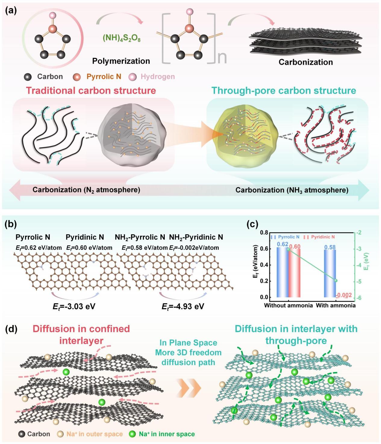 钠离子电池作为锂离子电池的重要补充,凭借其资源丰富、成本低廉等优势,在大规模电网储能和低速电动车领域展现出巨大的应用潜力。作为电池的核心组成部分,负极材料的性能直接影响钠离子电池的能量密度、循环寿命和倍率性能。在各类负极材料中,硬碳因其成本低、钠储存容量适中,被视为最具应用前景的钠离子电池负极材料之一。然而,传统硬碳材料因“层间限域”效应会阻碍钠离子传输,导致材料的倍率性能不佳。为提升倍率性能,通常需在材料中引入缺陷和表面位点,但过多缺陷和表面位点的引入会加剧电池中电解液的分解,形成较厚的固态电解质界面(SEI)膜,造成大量不可逆的钠损耗,从而导致电池的初始库伦效率降低。如何在高倍率性能和高首效之间取得平衡,是硬碳负极材料研究领域长期以来面临的关键挑战。