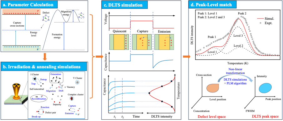 图1. 第一性原理驱动的辐照半导体深能级缺陷多维度鉴定的多尺度模型框架。