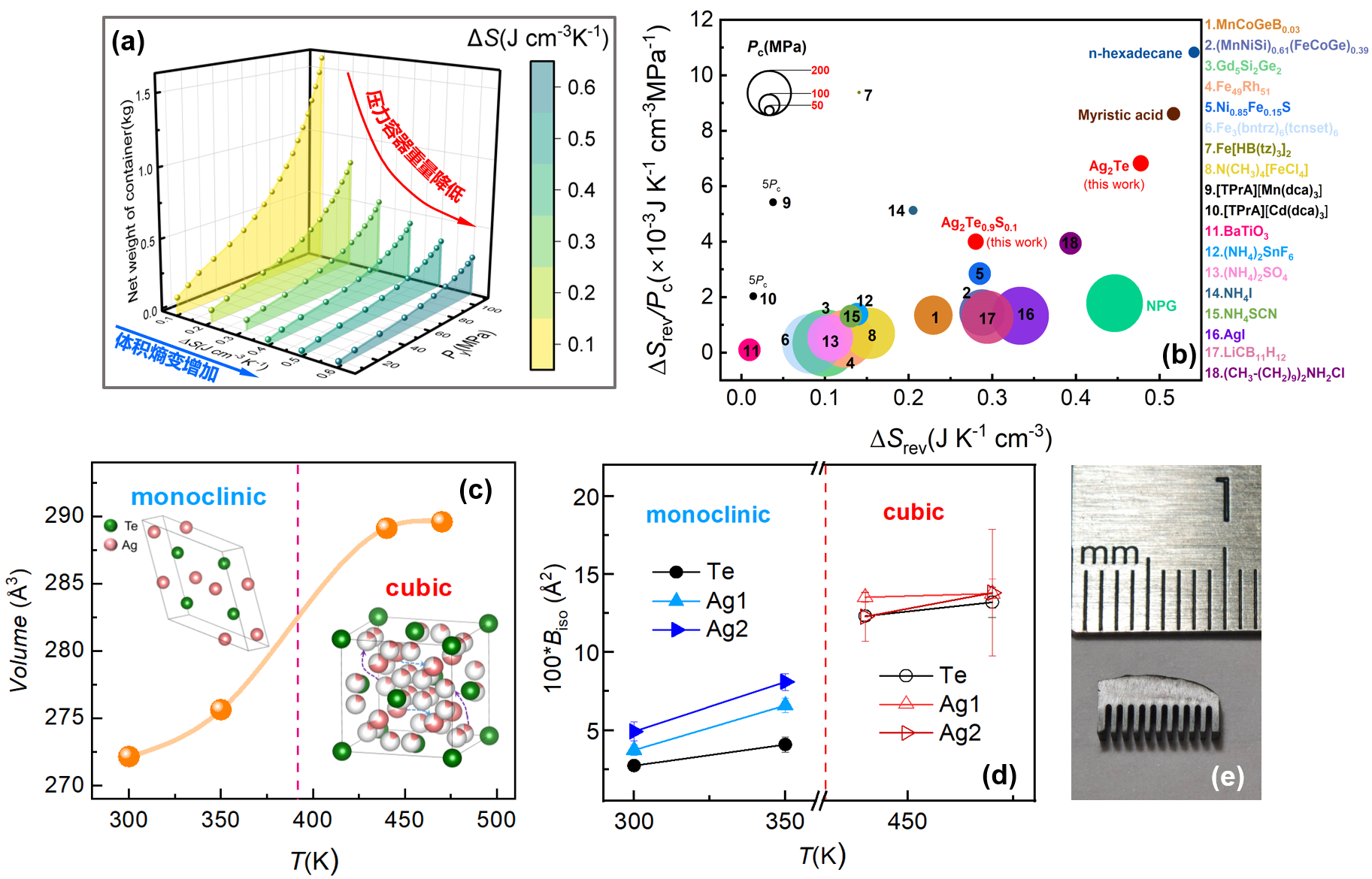 为解决这一难题,研究团队研发了一种新型高密度Ag2Te1-xSx材料。研究表明,在仅70 MPa的中等驱动压力下,该材料实现了0.478 J·cm-3·K-1的可逆体积熵变,刷新了当前无机压卡材料的最高纪录。其压卡强度高达6.82 mJ·cm-3·K-1·MPa-1,不仅远超多数已报道的无机压卡材料,甚至优于新戊二醇等经典的有机庞压卡材料。进一步研究表明,该材料巨大的体积压卡效应源于压力诱导的立方相至单斜相结构转变(相变时晶格体积变化约为5.4%),以及相变过程中银离子扩散动力学的显著变化。值得一提的是,该材料体系还具备较高热导率(2.02–2.28 W·m-1·K-1),有助于实现高效热交换,进而提升制冷效率;同时,还显示出良好塑性,可轻松加工成1毫米级小球或0.5毫米以下薄片;更重要的是,经过剧烈塑性变形、热冲击循环及反复压力加载/卸载后,压卡性能仍保持稳定,显示出优异的服役可靠性。