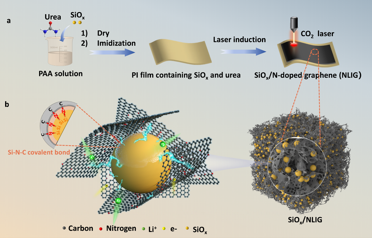 图1. 氧化亚硅/氮掺杂激光诱导石墨烯复合材料的制备工艺及储锂机理示意图。