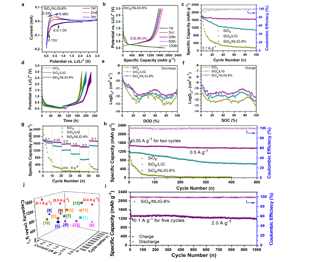 图2. 氧化亚硅/氮掺杂激光诱导石墨烯复合材料的电化学性能。