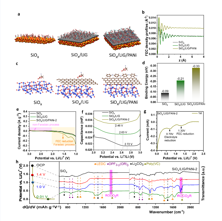 为进一步解决传统SEI层机械稳定性与离子传输效率问题,团队通过多维度探索,提出了一种采用聚苯胺(PANi)和激光诱导石墨烯(LIG)分级双涂层协同调控策略(Compos. Part B-Eng., 2026, 310, 113156)。该策略实现了从原子尺度到宏观尺度的全方位优化:PANi层利用偶极-偶极相互作用,诱导氟化碳酸乙烯酯(FEC)在内亥姆霍兹平面富集并优先还原,形成富含LiF的高致密、高稳定性SEI层;而LIG三维多孔导电框架则有效分散了体积膨胀产生的应力。理论与实验均证实,分级双涂层不仅大幅提升了FEC的吸附密度与结合能,还有效保障了电极界面在反复膨胀收缩下的结构完整性。优化后的负极材料在2.0 A/g下循环1000次后容量保持率达到87.7%,且表现出优异的机械韧性。