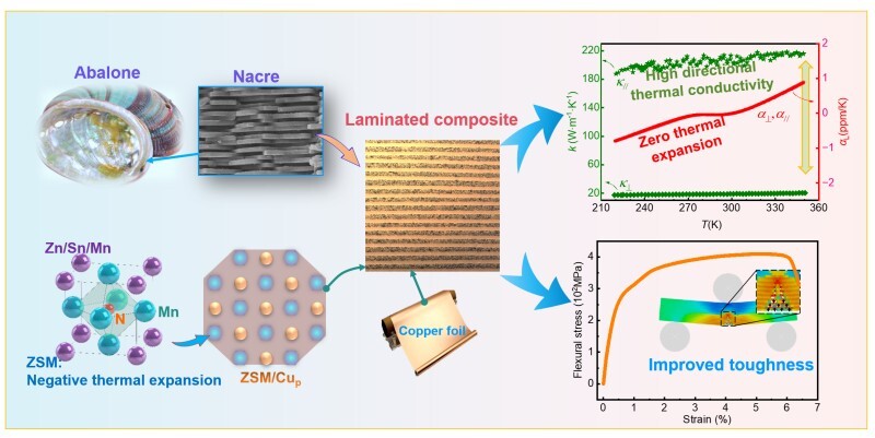 图1. 仿贝壳结构的叠层铜基复合材料及其零膨胀特性、单向高热导率和强韧性。