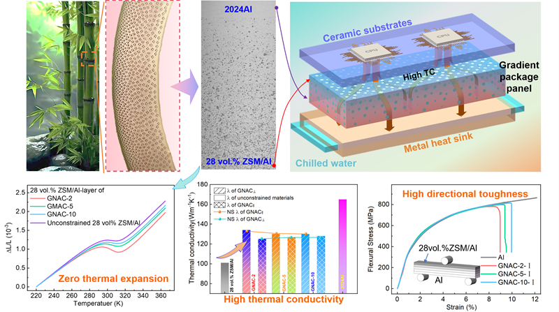 图2. 仿竹茎维管束梯度分布的铝基复合材料及其渐变热膨胀系数(分别与芯片和热沉的膨胀系数匹配)、高热导率和强韧性。