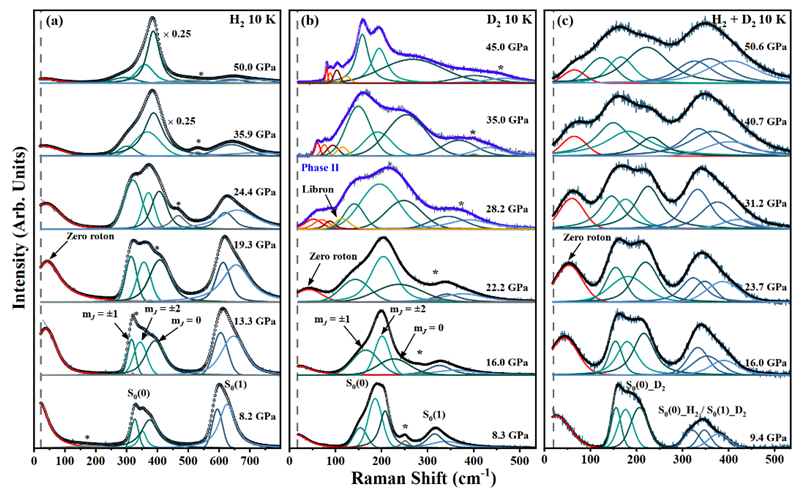 在此基础上,研究团队对系统进行进一步优化,对高压稠密氢(H2)、氘(D2)及其混合物开展了系统的压力-温度拉曼光谱测量,首次明确观测到了ΔJ=0这一“被藏起来的”激发信号。研究发现,在气态时,该激发拉曼位移为零;但在固态中,该激发拉曼位移偏离了零值。在约25 GPa、10 K条件下,氢、氘及其混合物分子的拉曼位移均出现在约50 cm-1处。这一现象表明ΔJ=0跃迁频率不依赖于同位素质量,其拉曼激发来源于同一个转动能级间的跃迁,是一种区别于传统谐振子与量子转子的全新激发模式,突破了常规认知。