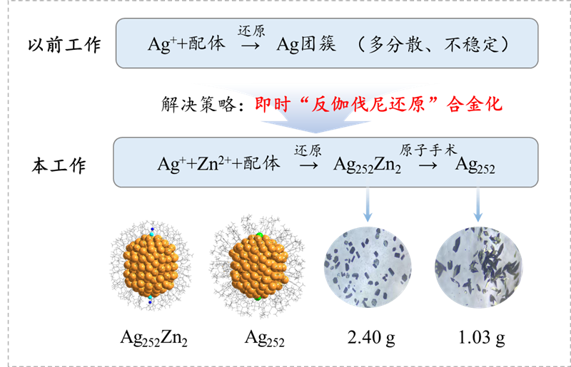 当金属纳米颗粒尺寸减小至临界尺度时,其电子结构会发生由连续能带的金属态向离散能级的分子态转变。揭示物质连续态向分子态的精准临界尺寸是纳米科技的一个核心问题,也是重大挑战,特别对于相对活泼的金属纳米粒子而言,存在稳定性差和多分散性等难题。合金化是一种有效的稳定化策略,研究团队早期提出的“反伽伐尼还原”(Angew. Chem. Int. Ed. 2012, 51, 2934-2938; 2018, 57, 4500-4504; 2020, 59, 3073-3077; 2025, 64, e202420931; J. Am. Chem. Soc. 2015, 137, 9511-9514; 2015, 137, 15350-15353; 2020, 142, 12140-12145; Acc. Chem. Res. 2018, 51, 2774-2783等)为合金化提供了一种不可替代的、方便的策略,但以往主要考虑对分离团簇实施“反伽伐尼还原”合金化,而溶液里即时生成、未加分离的金属团簇物种的“反伽伐尼还原”特性往往被科研人员忽视。在本研究中,研究团队利用即时生成的银纳米团簇的“反伽伐尼还原”特性还原共存的锌离子(对照实验表明锌离子本身在类似的情况下不能被还原,需通过银团簇的帮助才能被还原),通过合金化增强了银纳米团簇的稳定性,从而大大提高产率,实现了含1796个原子的银-锌纳米团簇(Ag252Zn2)的克级制备,单晶质量达2.40克,产率较已有大尺寸同类材料单晶产量记录提升了两个数量级。在此基础上,团队进一步开发了类似“原子手术”的精准去合金化技术,在不破坏纳米粒子框架结构的前提下,精准移除两个锌原子,成功获得了1.03克纯银纳米团簇晶体(Ag252)(图1)。结构解析表明,Ag252Zn2与Ag252均具有精确的五重孪晶面心立方结构(图2)。另一个重要的发现是尽管这两个团簇具有较大的尺寸,并且在溶液里显示了类等离子体吸收,但超快光谱和电子顺磁共振分析表明它们仍为分子态,尚未进入金属态(图2),表明超快动力学相对于稳态吸收光谱用于判断金属纳米粒子金属性更为可靠。此外,得益于晶体的大量合成,在本工作中还观察到结晶诱导的光热转换增强以及尺寸相关的吸收系数变化。